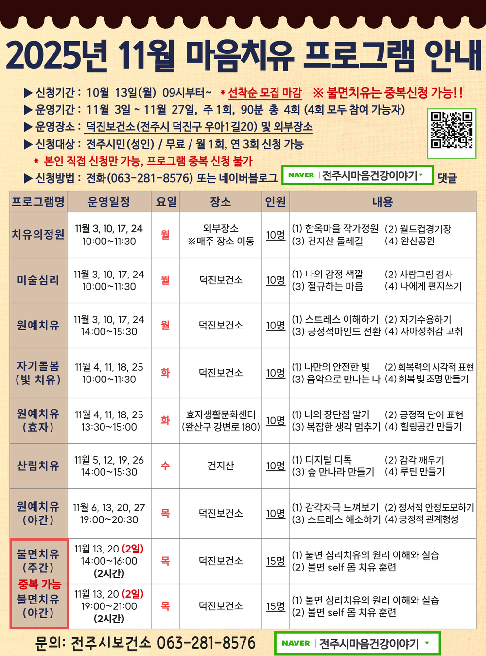 전주시보건소 11월 마음치유 프로그램 신청 안내