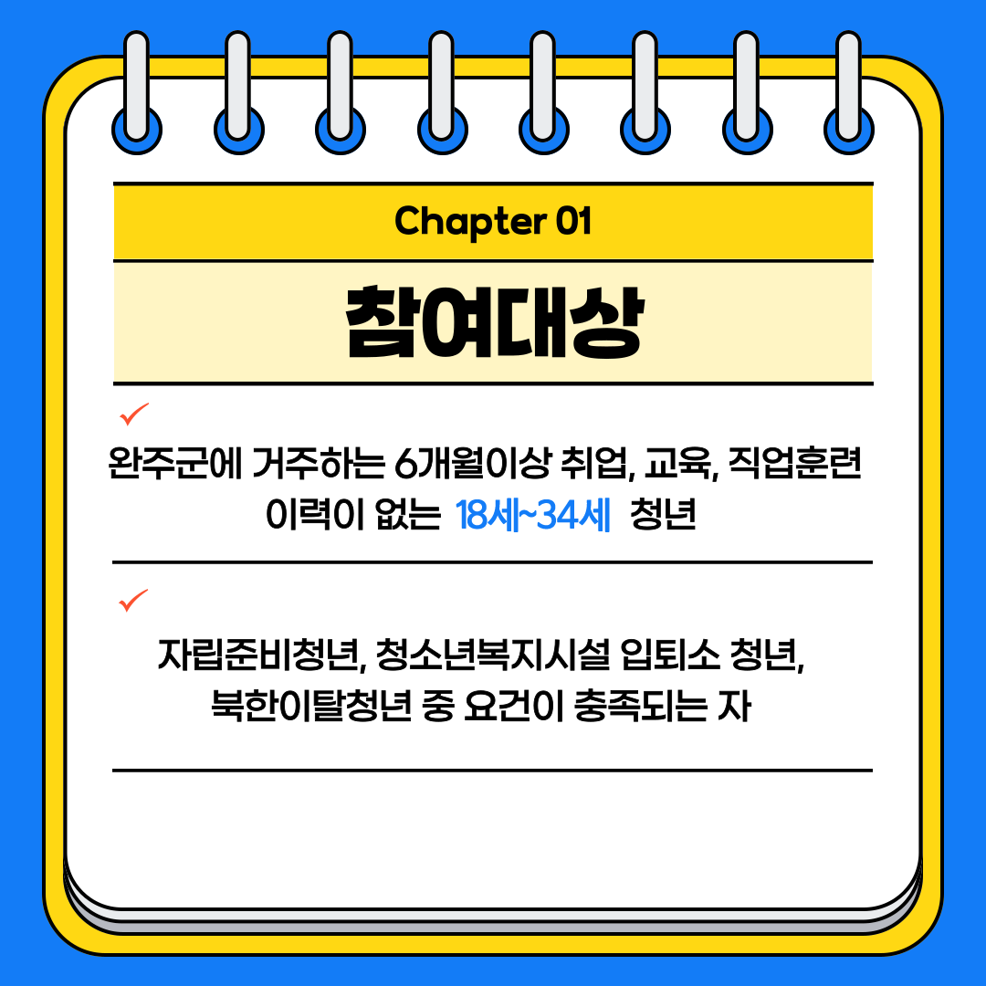- 완주군에 거주하는 6개월 이상 취업,교육,직업훈련 이력이 없는 18~34세 청년