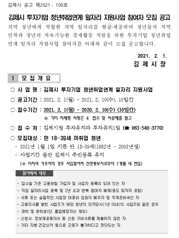 김제시 투자기업 청년취업연계 일자리 지원사업