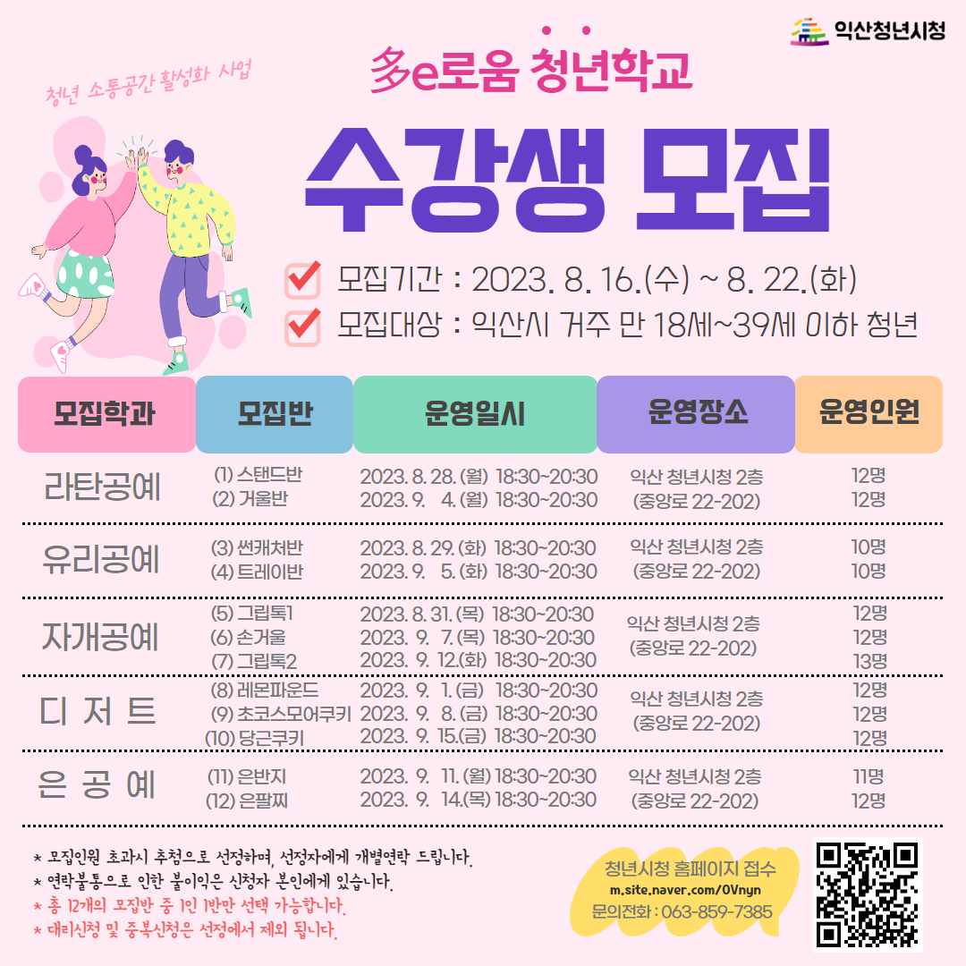 청년 소통공간 활성화 사업 청년시청 多e로움 청년학교 수강생 모집