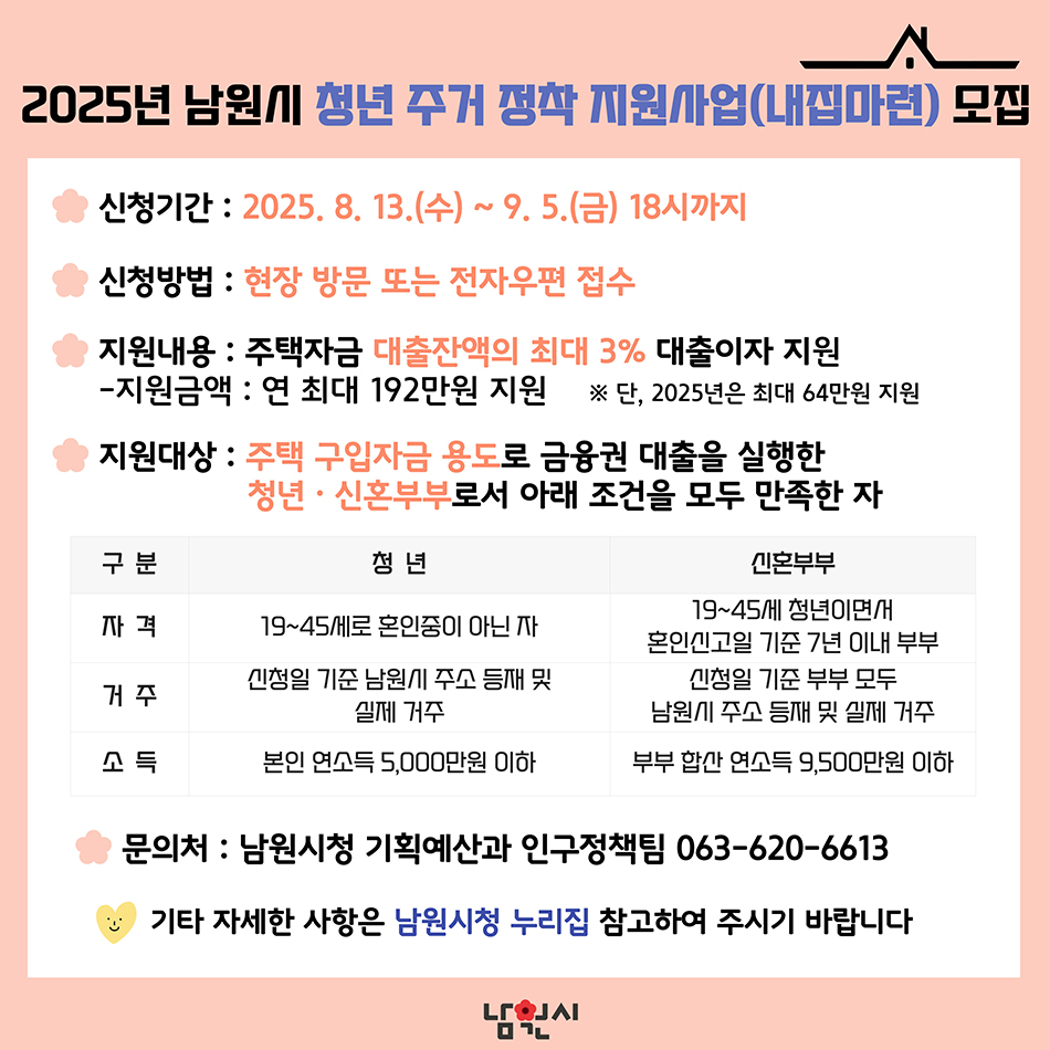 2025년 남원 청년 주거 정착 지원사업(내집마련) 신청자 모집
